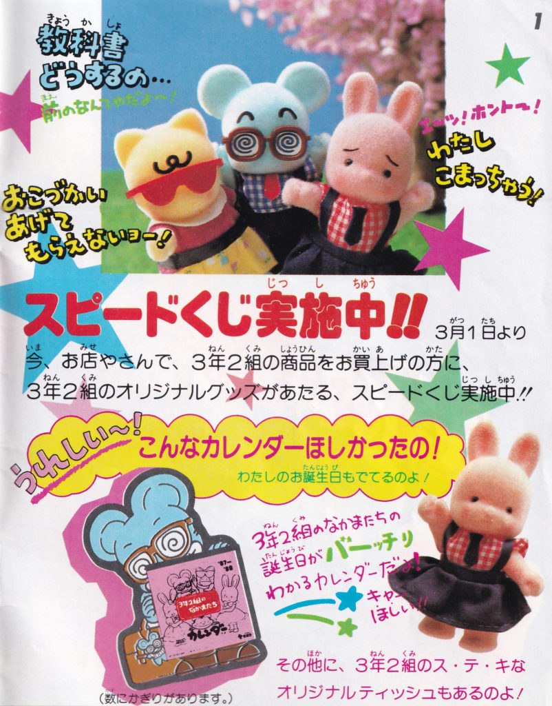 Wai Wai Times vol 6 in 1987 there is a notice for a speed lottery for anyone who purchased products from this line. You could win a limited and exclusive 1987/1988 calendar which showed all the character birthdays. Tissues are also mentioned, which I assume were given for losing tickets.